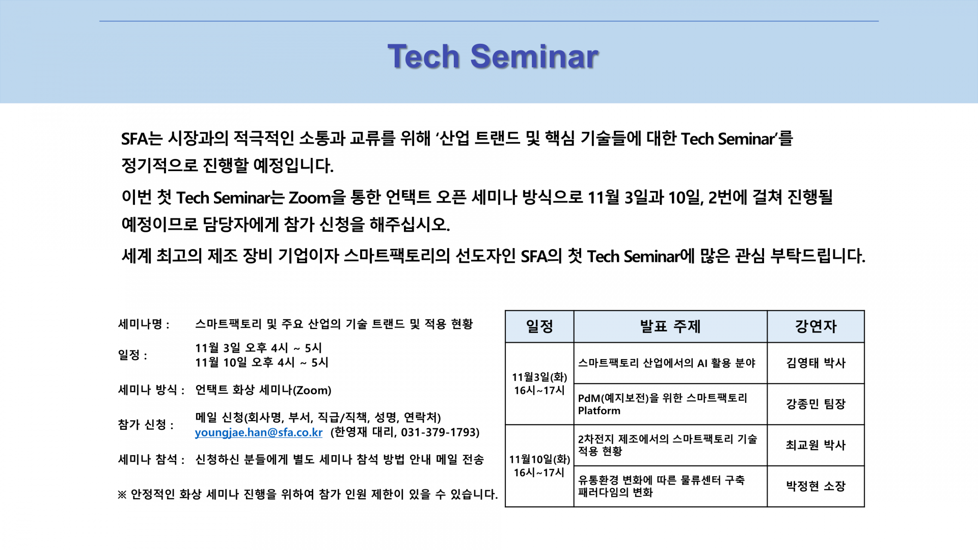 SFA Tech Seminar 참가 신청 : youngjae.han@sfa.co.kr